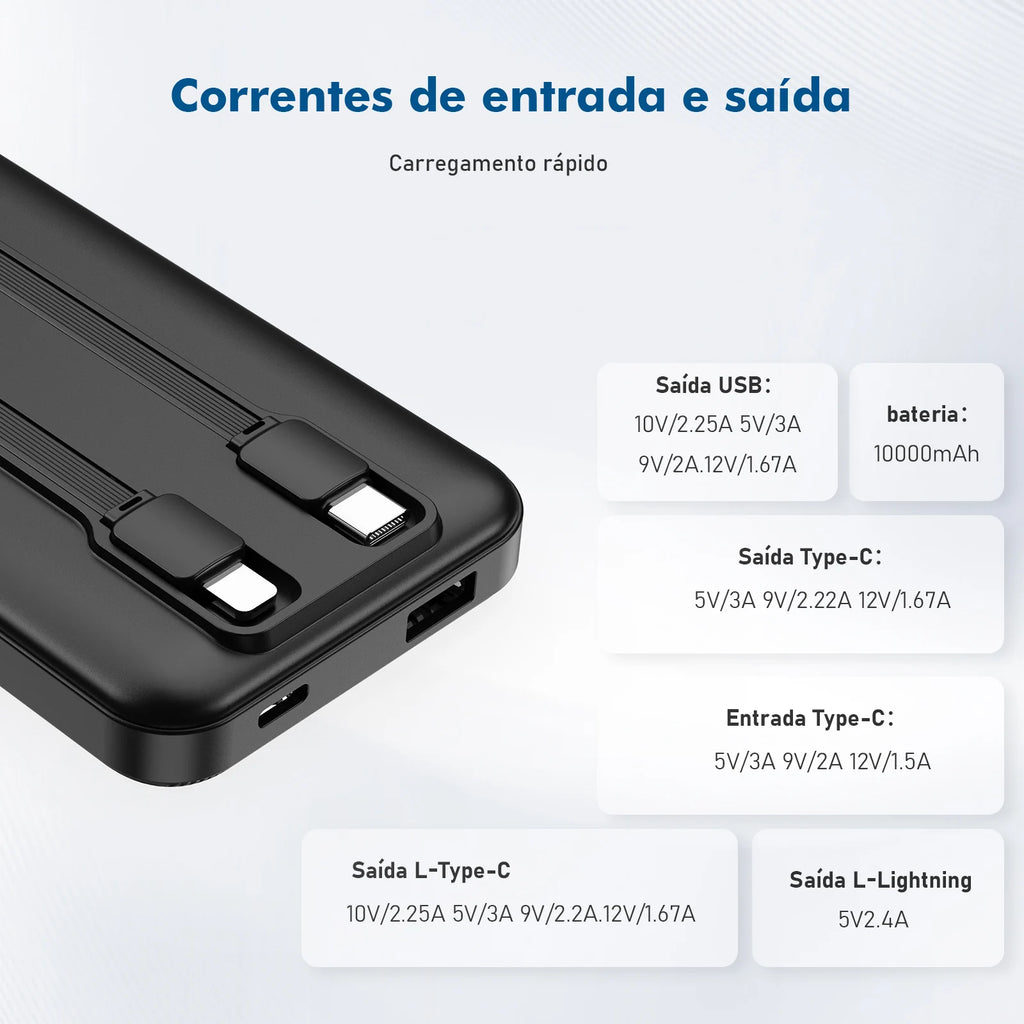 CaracterísticasCabos embutidos, Tela digital, Com lâmpada LEDSuporte a tecnologia de carga rápidaCarga rápida de sentido único